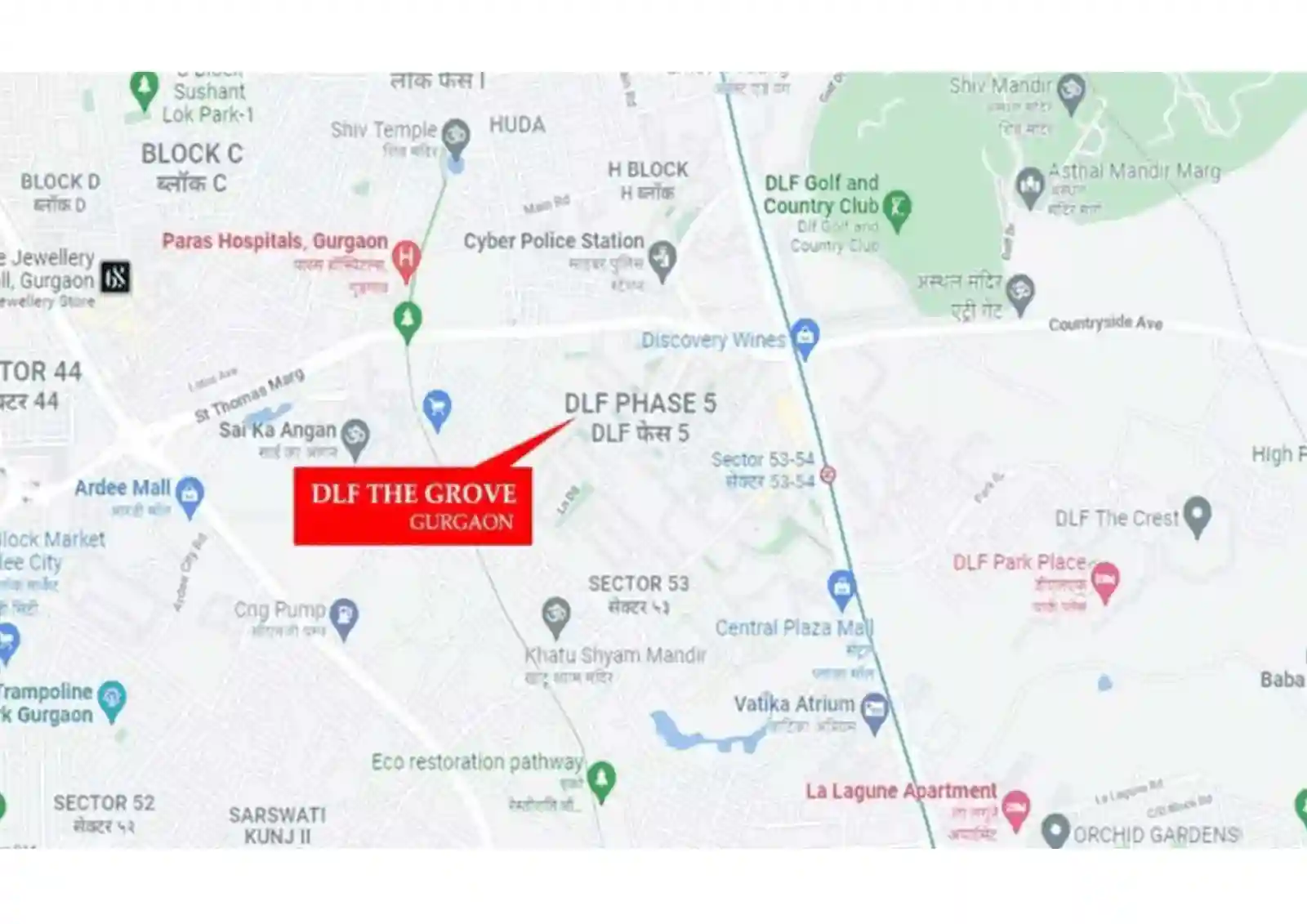 DLF The Grove Phase 5 is strategically located off Golf Course Road in Sector 54, Gurgaon—one of the city's most prime and well-connected areas. The location offers seamless connectivity to major landmarks and destinations across Delhi-NCR via the Dwarka Expressway and NH-8. Its strong infrastructure and urban planning significantly enhance the value of this address.