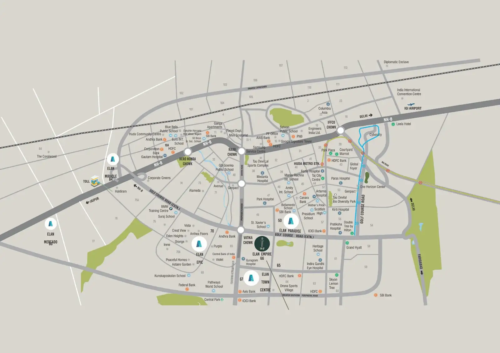 Elan Empire is located on Golf Course Extension Road and enjoys excellent connectivity to major parts of Gurgaon and Delhi NCR. It is close to residential areas and corporate hubs and has easy road access, making it a smart place to invest or set up a business.