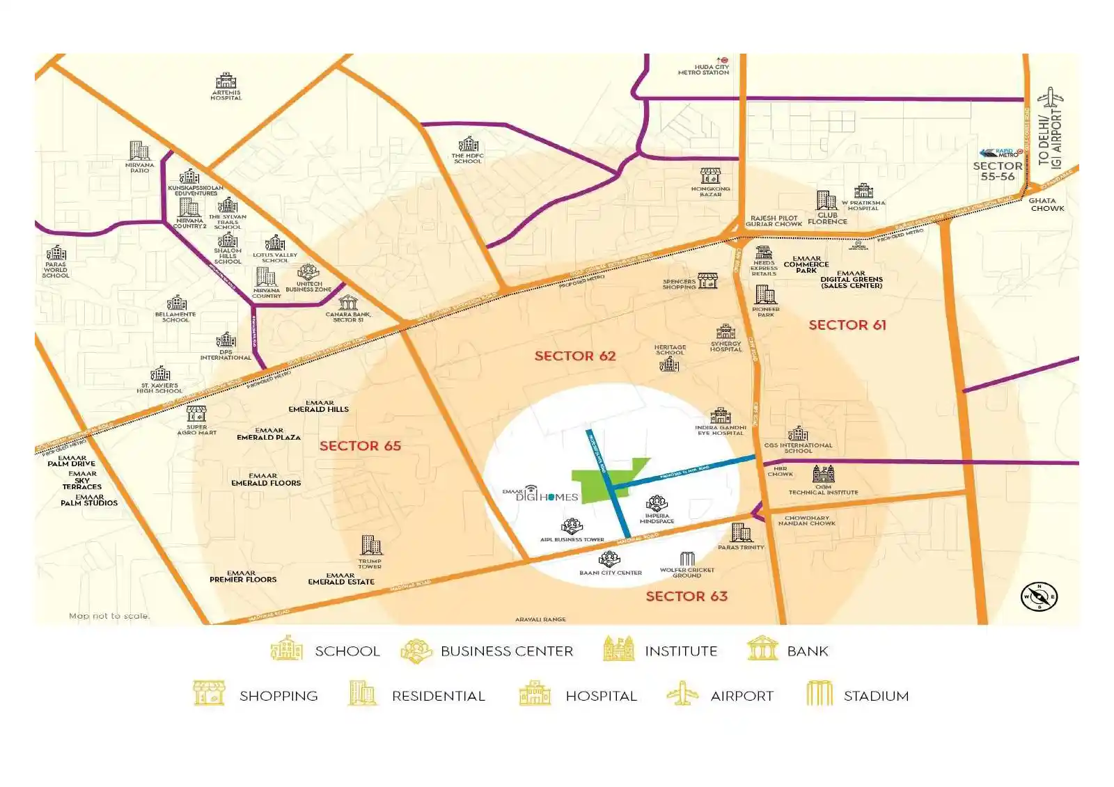 Strategically located in Sector 62, Emaar Digi Homes is well-connected to major roads like Golf Course Extension Road, Golf Course Road, Sohna Road, and Southern Peripheral Road. Its proximity to schools, hospitals, offices, and malls ensures a convenient and stress-free living experience, making it one of the best-located projects in Gurgaon.