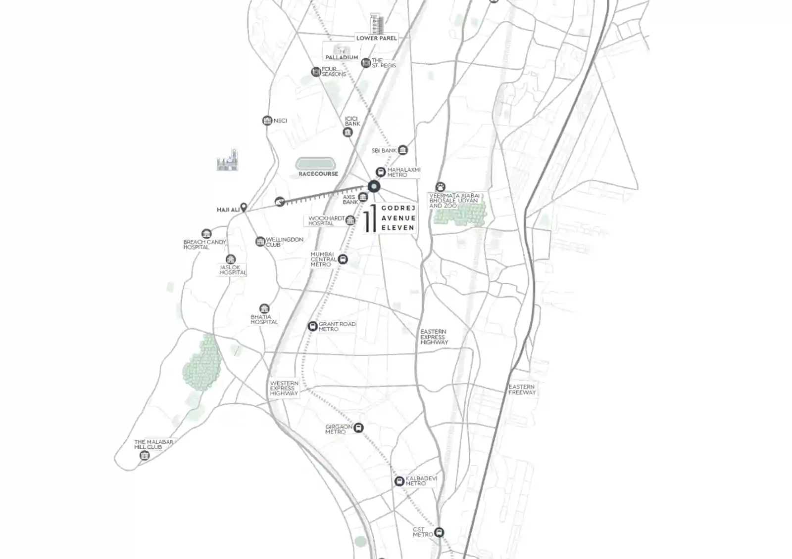 It is located in the heart of Mahalaxmi, one of Mumbai's most well-connected areas. Godrej Avenue Eleven Mahalaxmi offers seamless access to major commercial hubs, reputed schools, hospitals, and premium shopping malls. Whether for work, education, or healthcare —everything is conveniently located nearby.