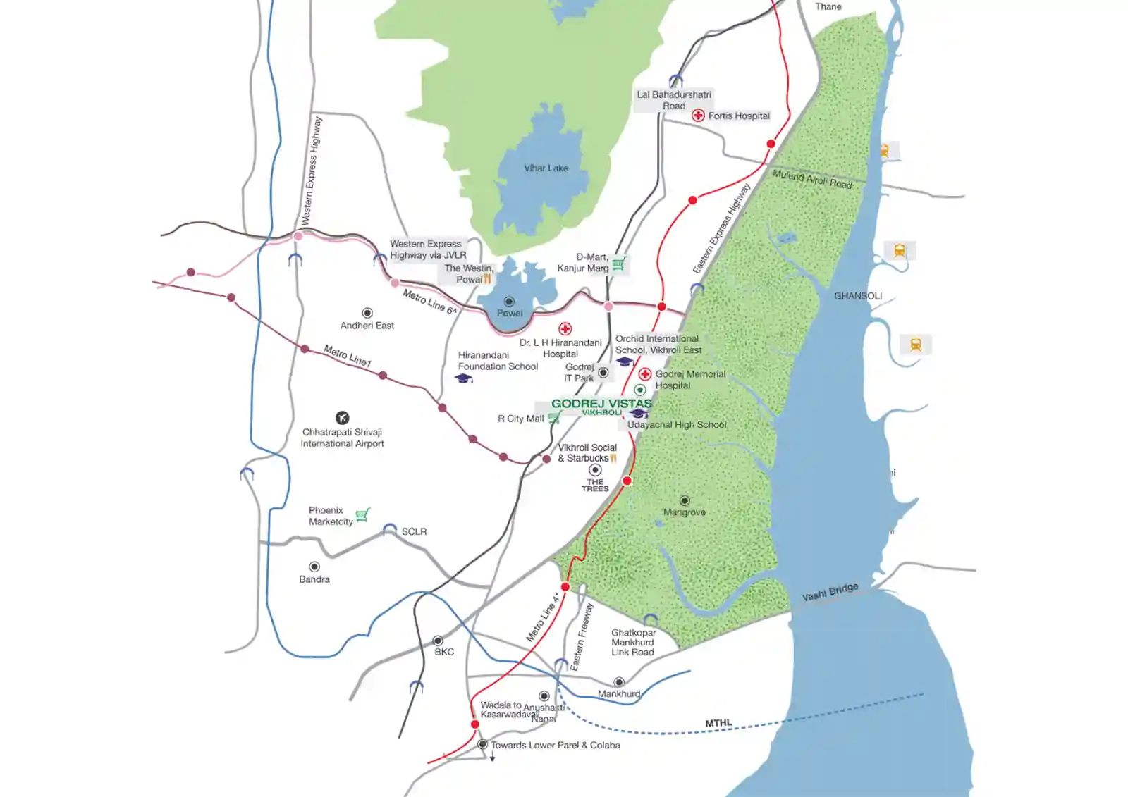 Godrej Vistas Vikhroli Mumbai is just 350 meters from the Eastern Express Highway and only 1.8 km from Vikhroli Railway Station. It is well-connected to the rest of Mumbai and gives you easy access to top schools, shopping malls, and hospitals.